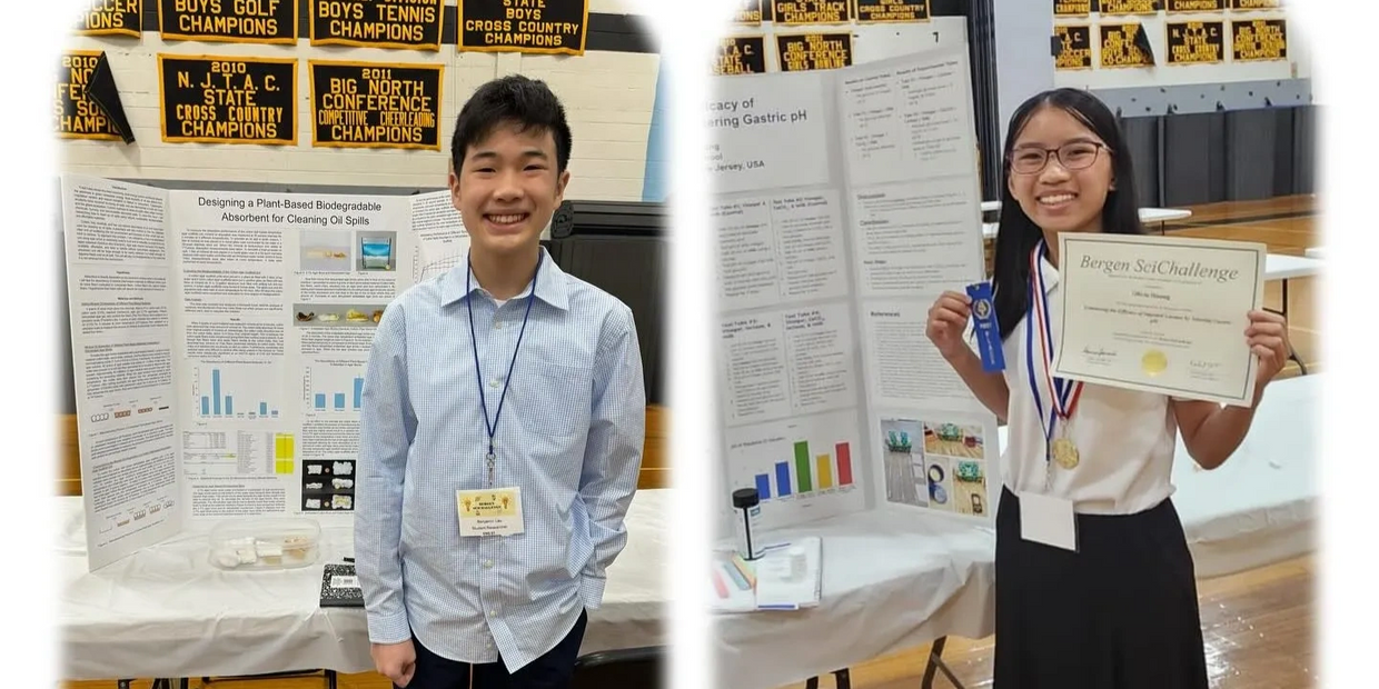 Ben won first place in Engineering and top 10% of the Bergen SciChallenge (held by Bergen County Academies in June). Olivia won first place in Chemistry and top 10% of the same fair.